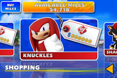 And just in time for my upgrade comes an update to All-Stars Racing! The update adds: Knuckles and Shadow as playable racers, a new track – Samba de Amigo’s mountainside Sun Fair track, a new home screen icon, Airplay-out mode, HDMI-out mode, iCloud saving, character faces on the minimap (originally racers were shown as anonymous red dots, now you’ll see that Beat is trailing you), Game Center profile pics on the minimap in multiplayer and many other improvements and bug fixes. I’ve explored the game some and found another unmentioned update, the ability to buy SEGA miles via in-app purchases. Very clever way to get a bit of money out of customers, SEGA. It should be noted that Knuckles, Shadow and the new track need to be purchased with SEGA miles. They are not unlocked once you update the app.